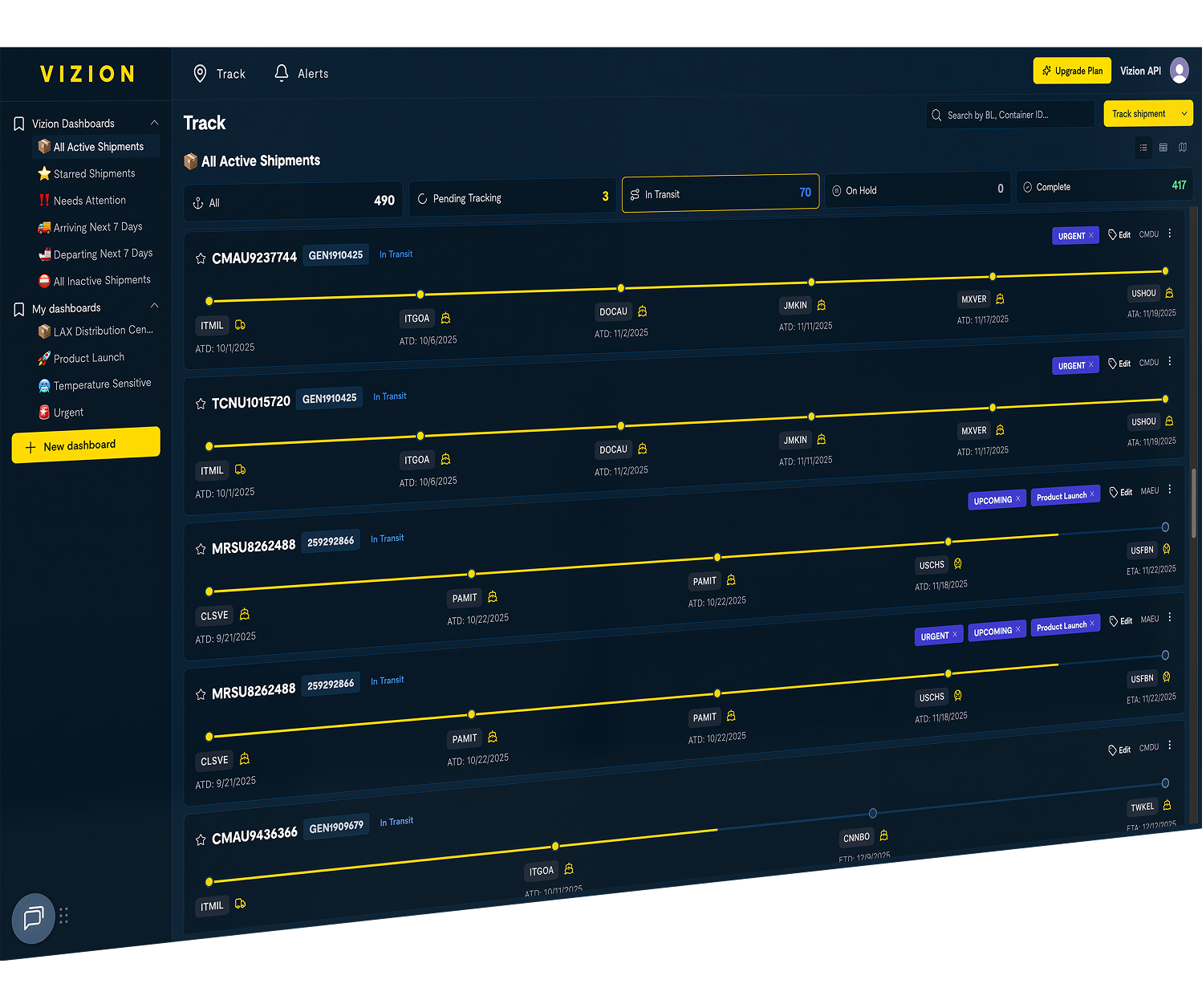 Vizion products enable companies to track and monitor individual shipping containers throughout their journey, with new capabilities that monitor 57% of global trade. The TradeView platform offers comprehensive global trade intelligence, allowing users to monitor and analyze over $7.5 trillion in goods from 130+ data sources, helping to identify risks and enhance supply chain resilience.