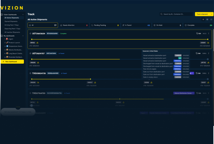 Vizion’s platform includes data of the highest quality, including multiple sources (EDI, AIS, port/terminal connections, plus others) that are already connected for instant-on capabilities. We refresh these sources multiple times daily to reduce latency to 6 hours or less.
