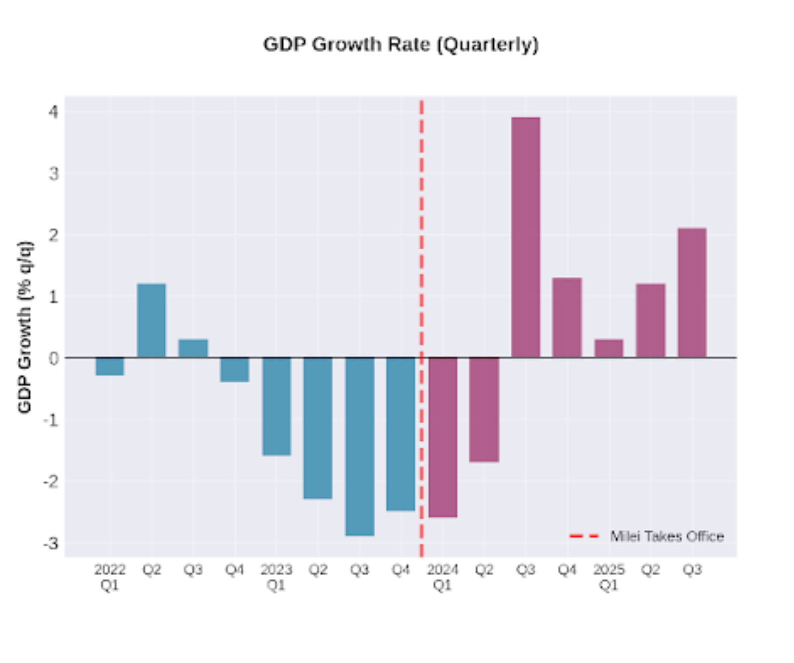 The social costs of adjustment were severe but temporary. Poverty rates peaked at 52.9% in the first half of 2024 before declining to 31.6% by mid-2025 as inflation moderated and real wages recovered. Consumer spending, which fell 20% during the worst of the adjustment, began recovering by the fourth quarter of 2024.