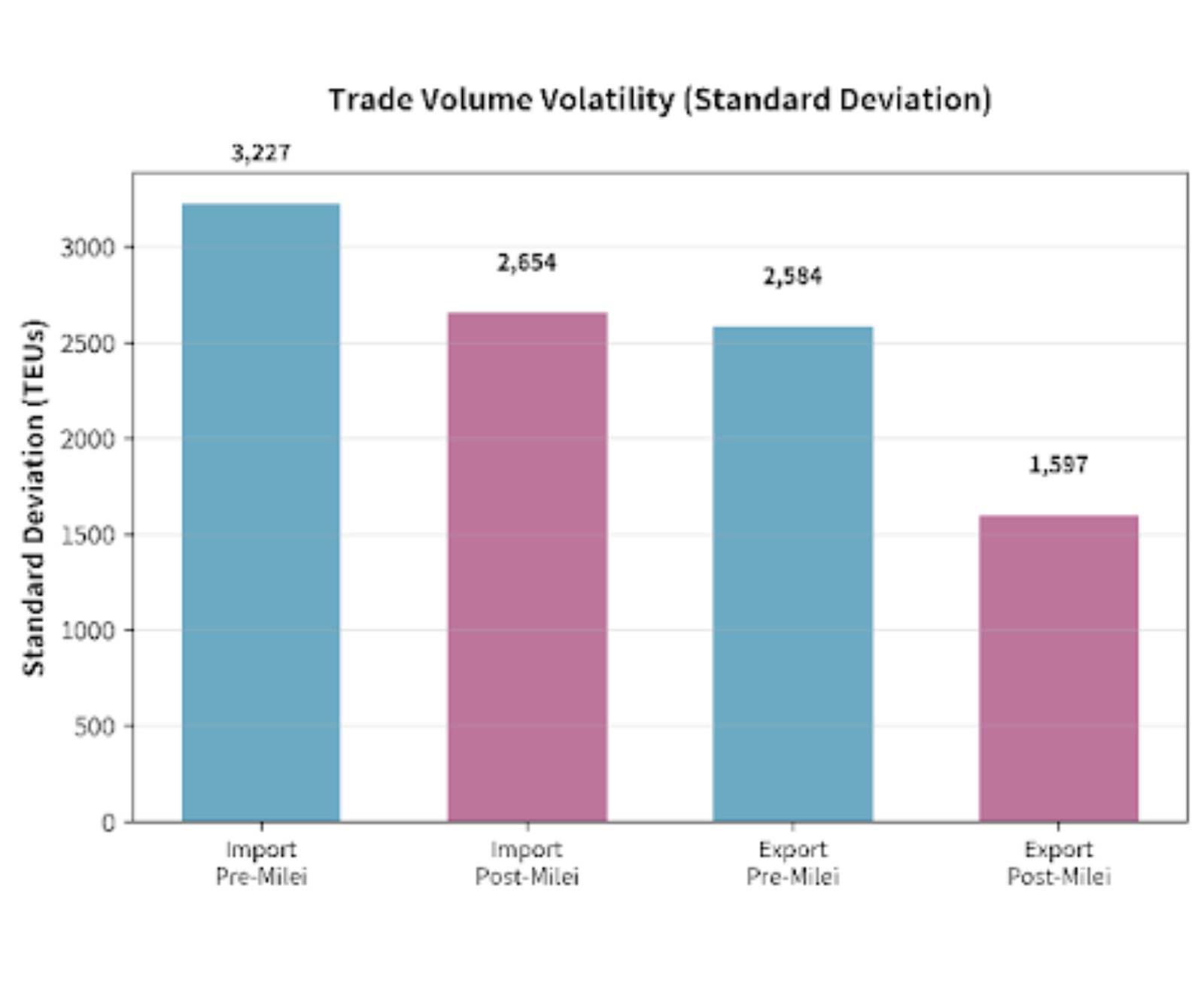 The trade balance improvement tells a compelling story of crisis-driven adjustment. Pre-Milei, Argentina maintained an average quarterly trade surplus of 9,481 TEUs. During the Milei era, this improved dramatically to 16,229 TEUs per quarter, representing a 71.2% improvement. The peak trade surplus occurred in 2024-Q3 at 25,305 TEUs, coinciding with the deepest point of import contraction and continued export resilience.