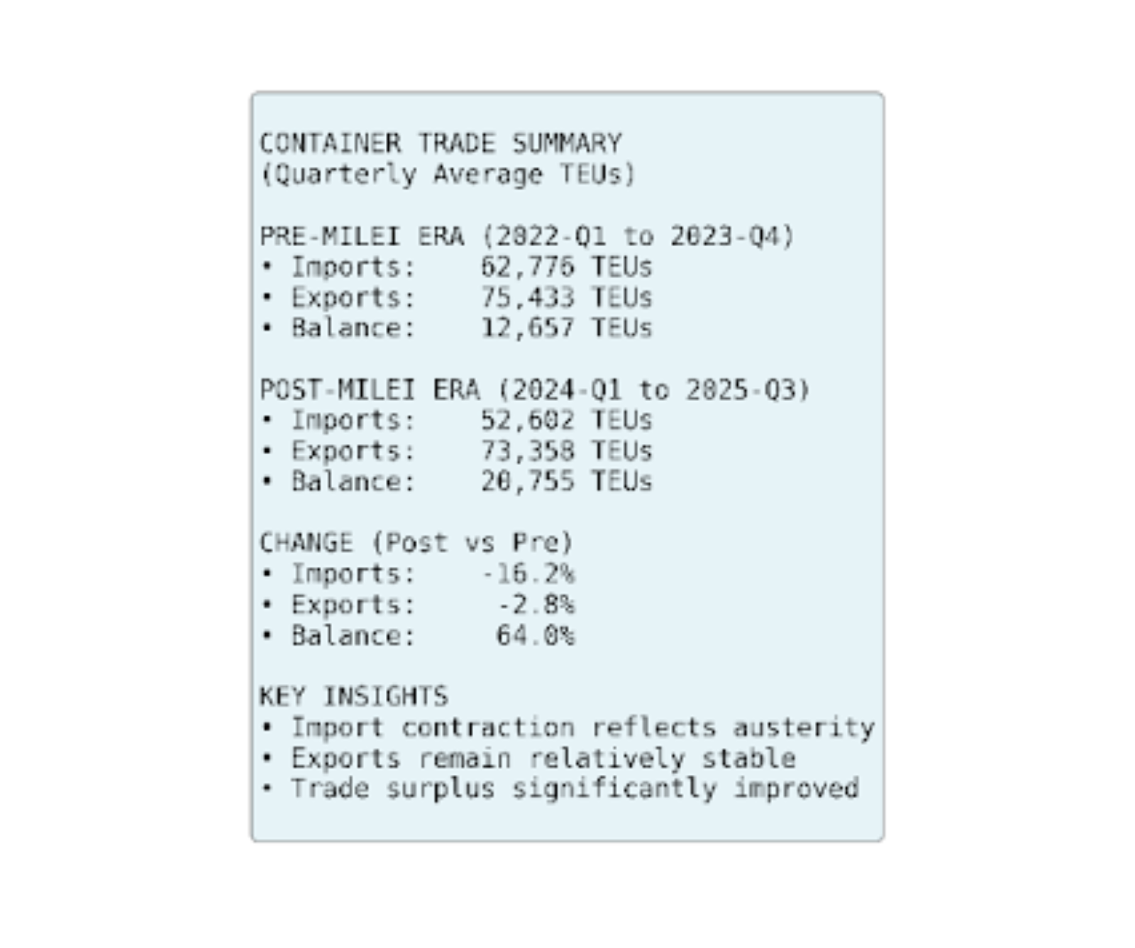 The most striking finding is the asymmetric nature of trade adjustment. Container imports declined by an average of 16.2% during the Milei era compared to pre-Milei levels, falling from an average of 62,776 TEUs per quarter to 52,602 TEUs. This contraction reached its nadir in 2024-Q1 at just 37,365 TEUs, representing a dramatic 48% decline from peak levels. However, imports have since recovered robustly, reaching 67,437 TEUs by 2025-Q3, indicating that the trade adjustment was largely cyclical rather than structural.