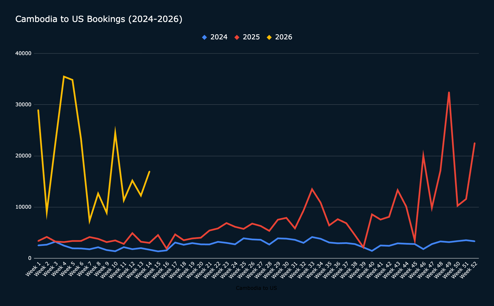 The weekly booking data reveals a corridor that went from modest and seasonal in 2024 to structurally elevated through 2025, and then broke to a new level entirely in early 2026. The step-change is not a single-week anomaly; it is a sustained re-rating of the lane.