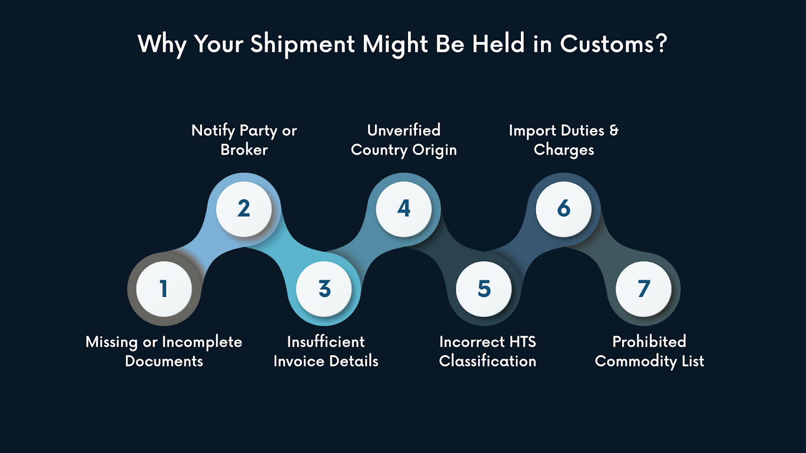 Incomplete or incorrect information in the Bill of Lading, commercial invoice, or HS codes can trigger holds.