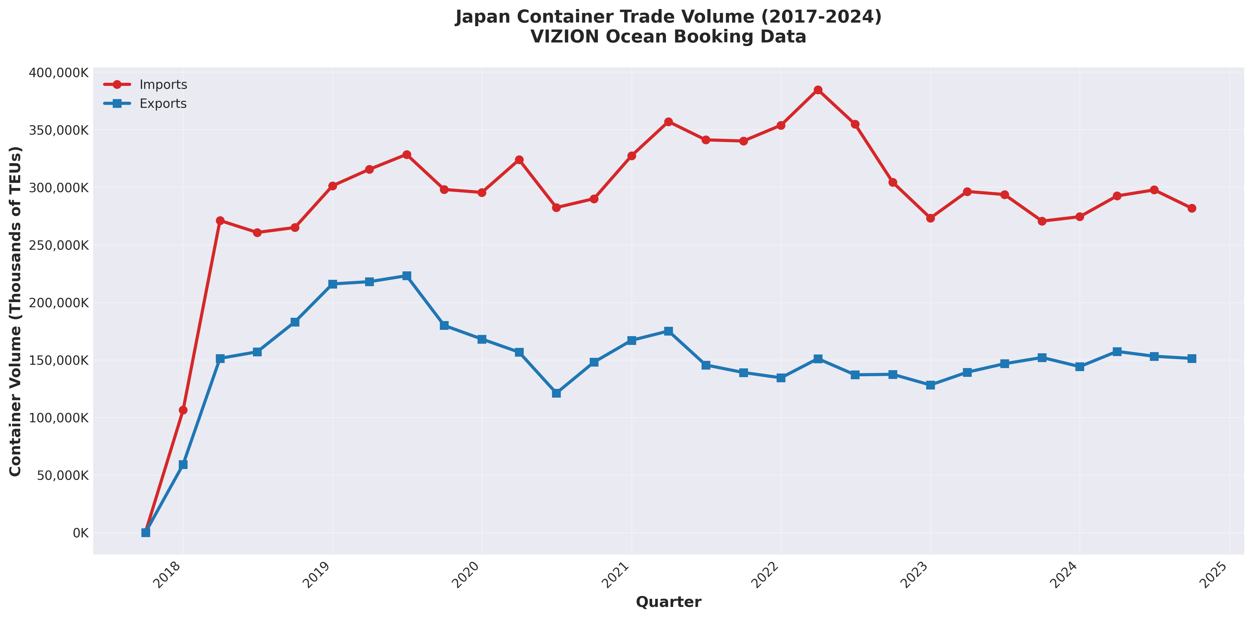 The VIZION container data provides complementary perspective: Japan's Q3 2024 container imports totaled 297,645 TEUs (up 1.4% year-on-year), while exports reached 153,109 TEUs (up 4.4%). The 1.94:1 import-to-export ratio in Q3 2024 represents slight improvement from the 2.02:1 ratio in Q3 2023, suggesting gradual rebalancing but persistent structural deficit.