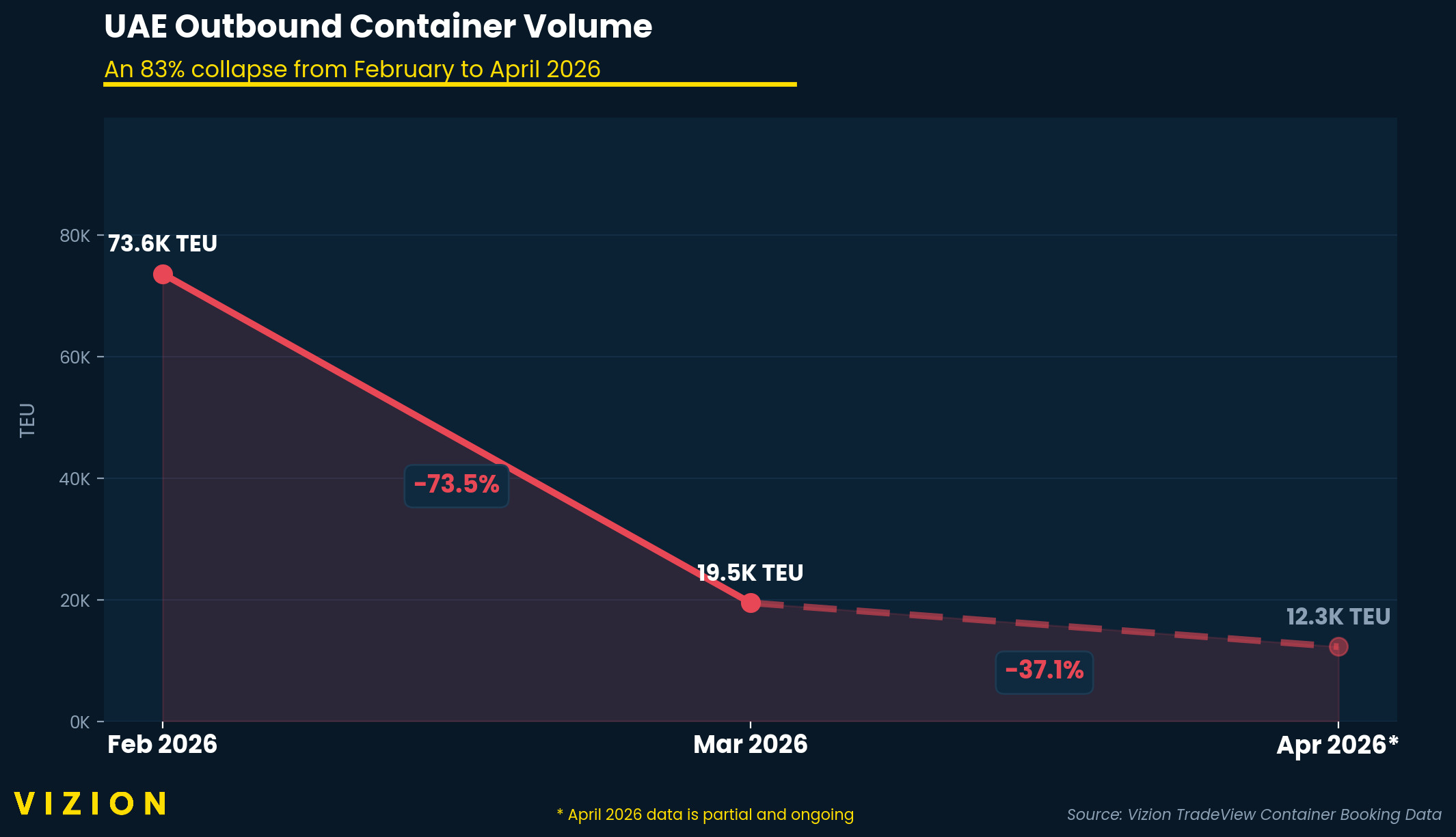 UAE outbound volumes collapsed 73.5% from February to March. From roughly 73,600 TEU in February to under 19,500 TEU in March. Through April 17, volumes had tracked at approximately 12,200 TEU for that partial period — with no sign of recovery.