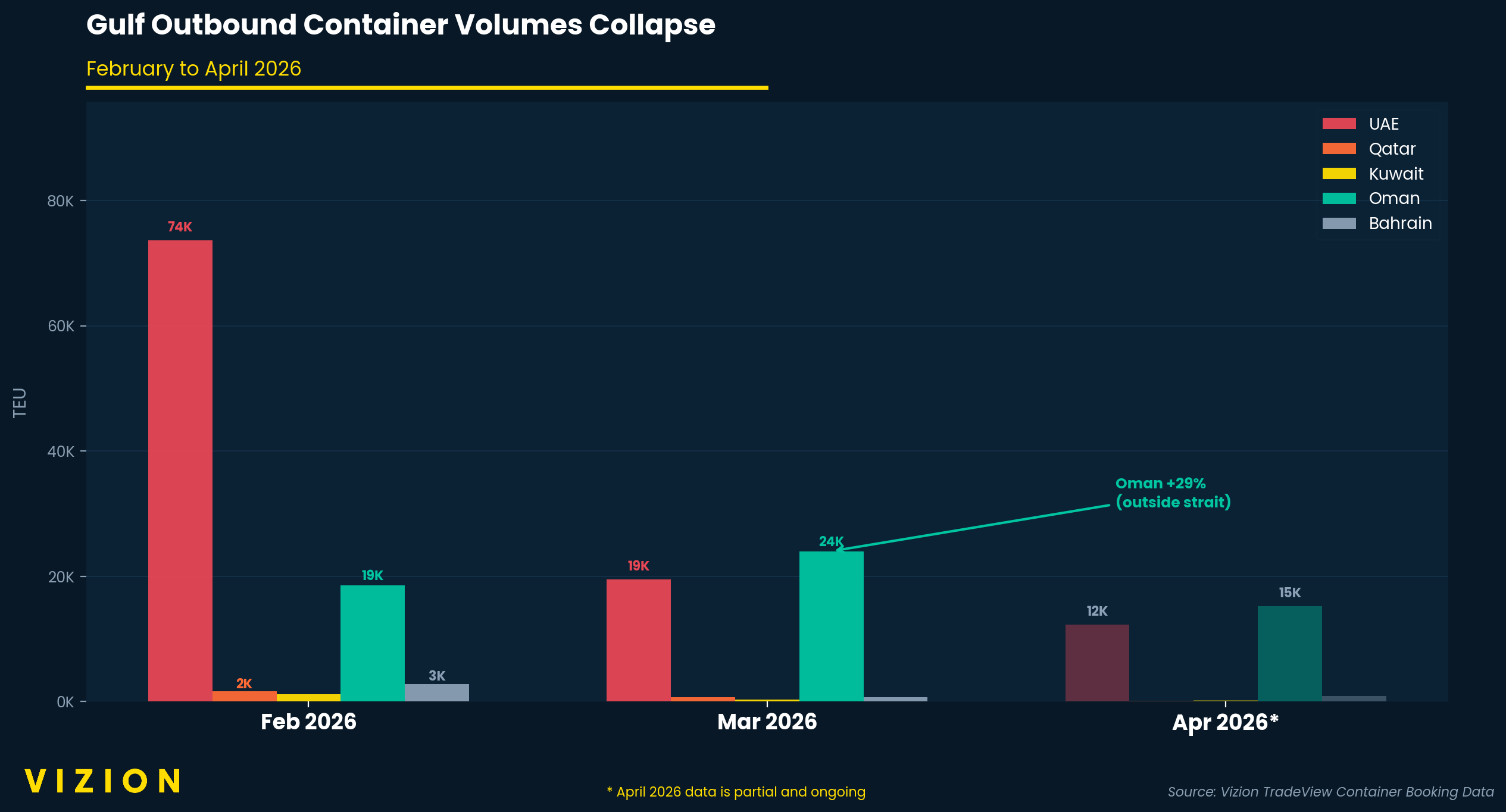 Vizion's TradeView container booking data shows Gulf outbound volumes collapsed sharply between February and March 2026. UAE volumes fell approximately 73.5%, Kuwait fell approximately 75.6%, and Qatar dropped approximately 60%. Through April 17 — the most recent data available at time of publication — volumes had not recovered. April figures represent only the first 17 days of the month and are not a full monthly comparison.