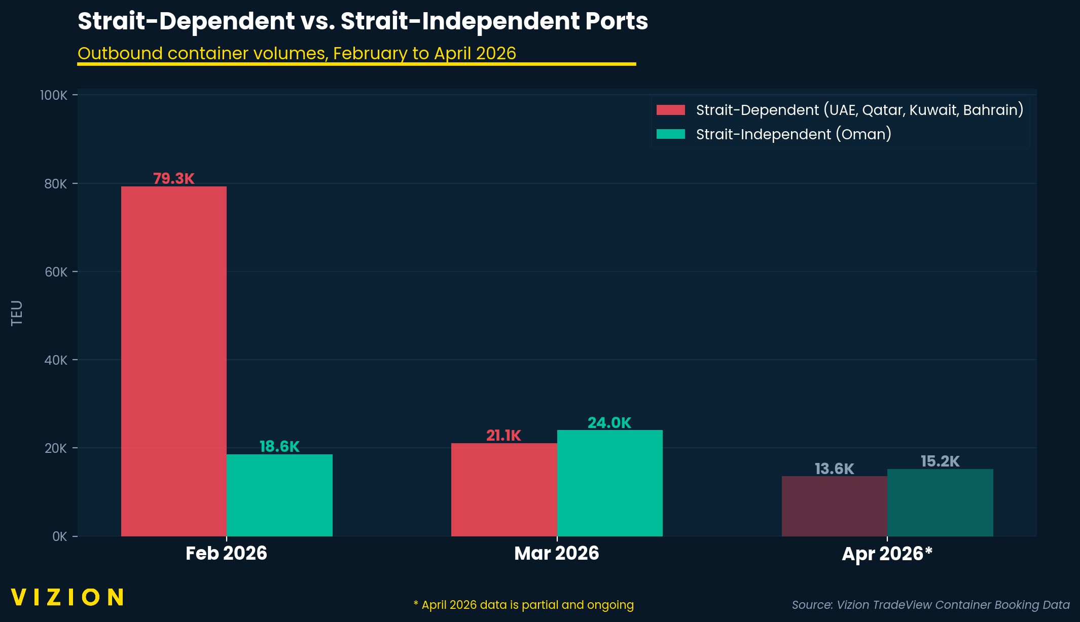 Oman's main container ports — Salalah and Sohar — are located on the Arabian Sea coast, outside the Strait of Hormuz. When the strait became unreliable for shipping, Oman became the only Gulf origin with direct ocean access unaffected by the disruption. Oman outbound volumes grew approximately 29% from February to March 2026 in Vizion's container booking data.