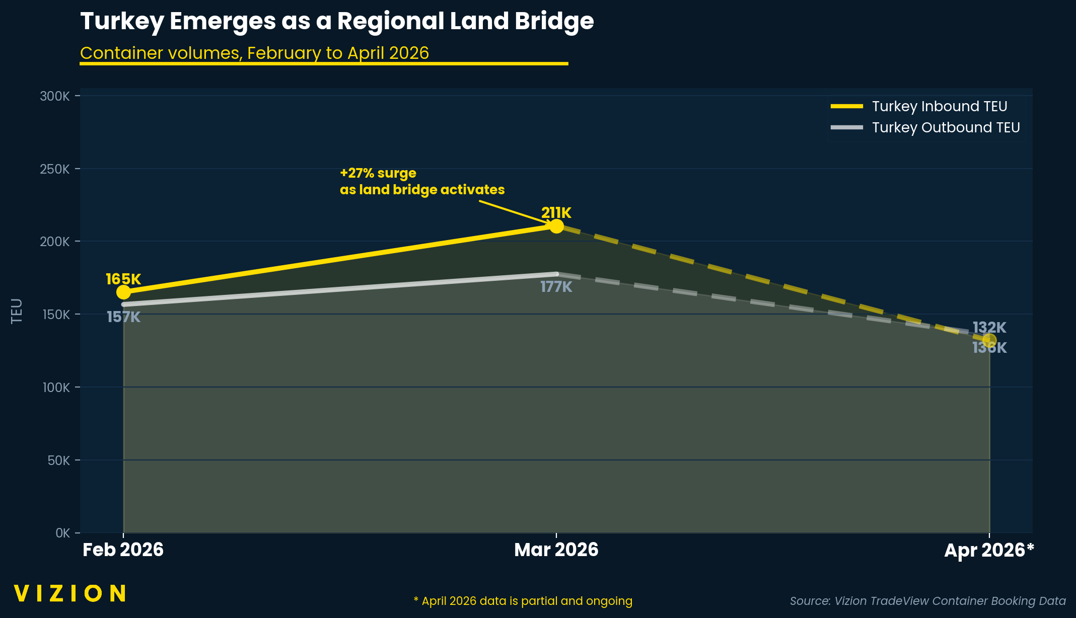 Turkey emerged as a key overland land bridge for freight that could no longer move through Gulf maritime lanes. Vizion's container booking data shows Turkey's inbound volumes grew approximately 27% from February to March 2026, rising from approximately 165,000 TEU to approximately 210,500 TEU — consistent with significant trade diversion through Turkish ports including Mersin and Iskenderun.