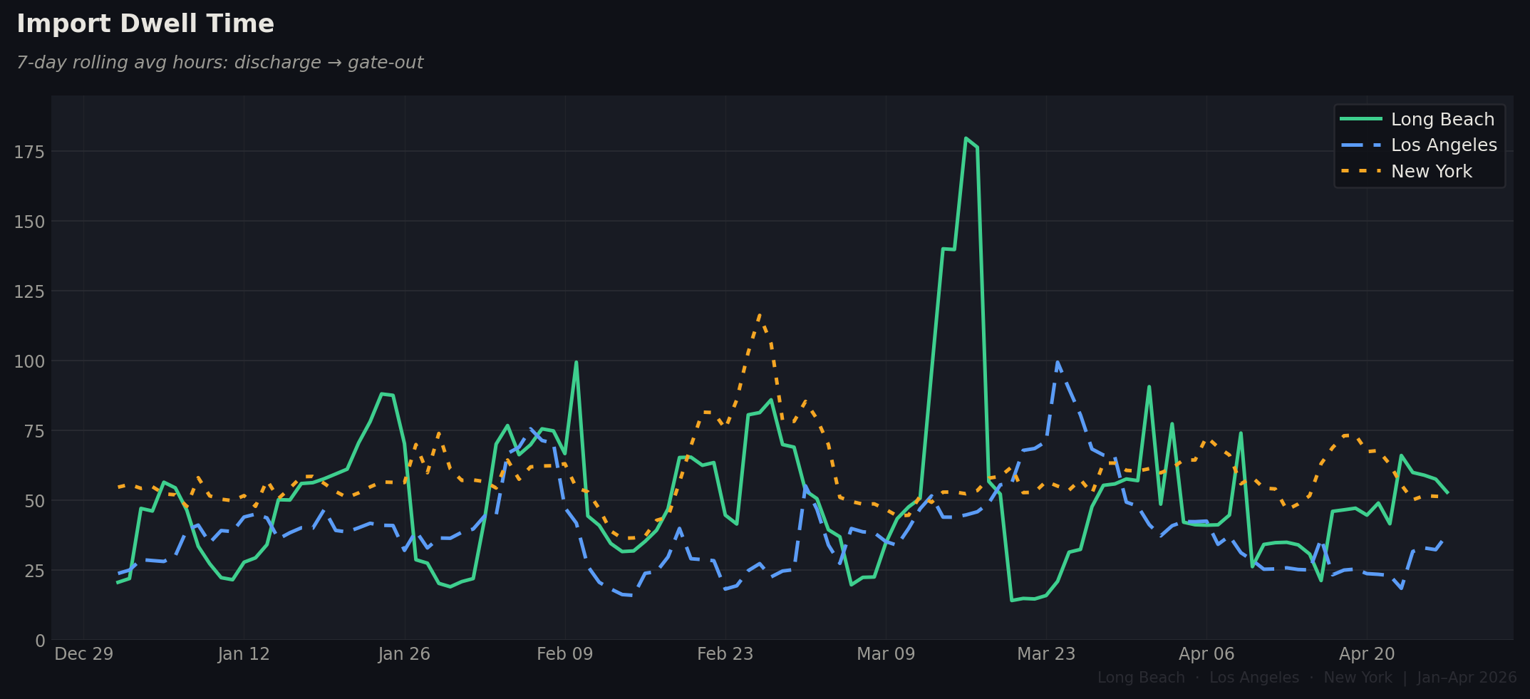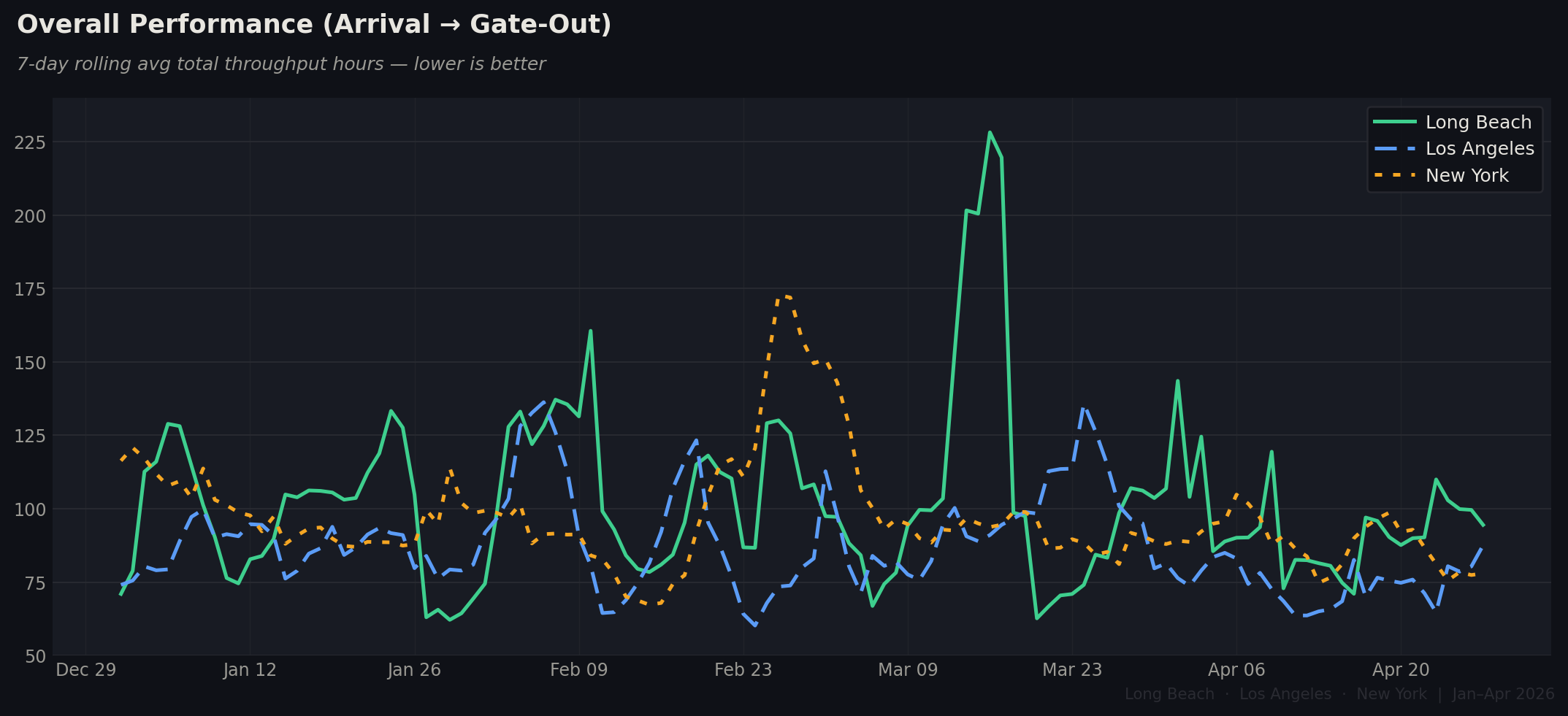 From January through late April 2026, the container throughput picture at Long Beach, Los Angeles, and New York tells three very different stories. Overall performance here measures total hours from vessel arrival to cargo gate-out — the full supply chain clock. Higher numbers mean worse performance. A mid-March dwell crisis at Long Beach, a New York anchorage crunch in February, and an LA surge then correction all show up clearly in the data.