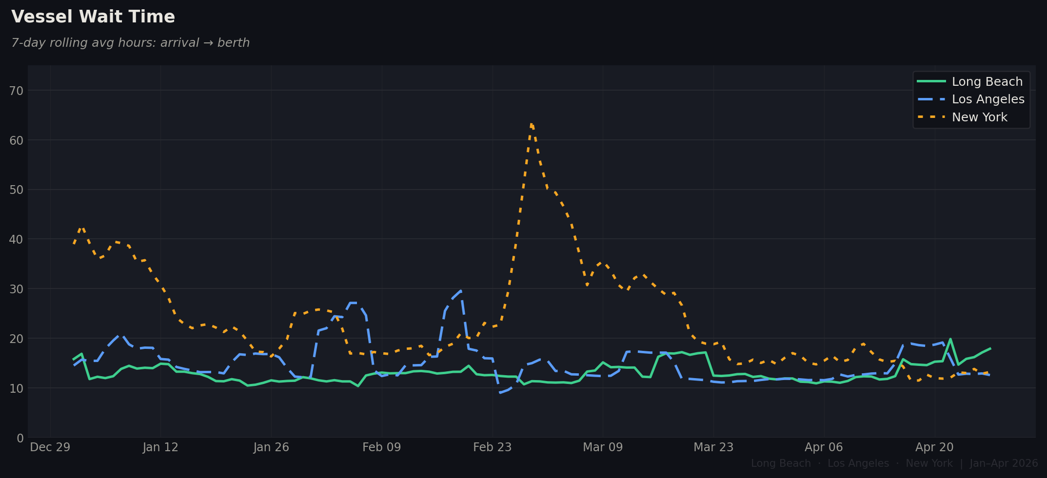 New York's late-February anchorage crisis is the defining vessel-side event of the period. Wait times surged from ~17 hours in early February to a peak of 63.9 hours around Feb 28 — ships sitting at anchor for nearly three days. The port largely cleared through April, dropping back to ~13 hours. LA also spiked in February (peaking near 29.6 hours) before resolving. Long Beach remained the most stable throughout, rarely exceeding 20 hours.