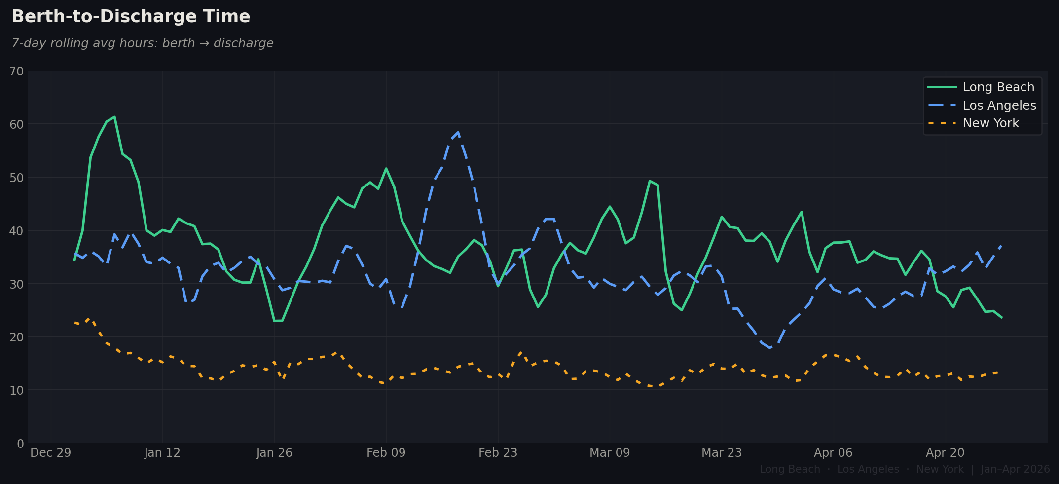 New York's crane productivity is a genuine structural advantage — averaging just 14 hours berth-to-discharge versus 37 hours at Long Beach and 32 hours at LA. The West Coast ports handle larger vessels with more containers per call, which inflates this number, but the gap is still striking. LA showed the most dramatic improvement: after peaking near 58 hours in late February, discharge time fell below 20 hours by late March — a meaningful operational gain.
